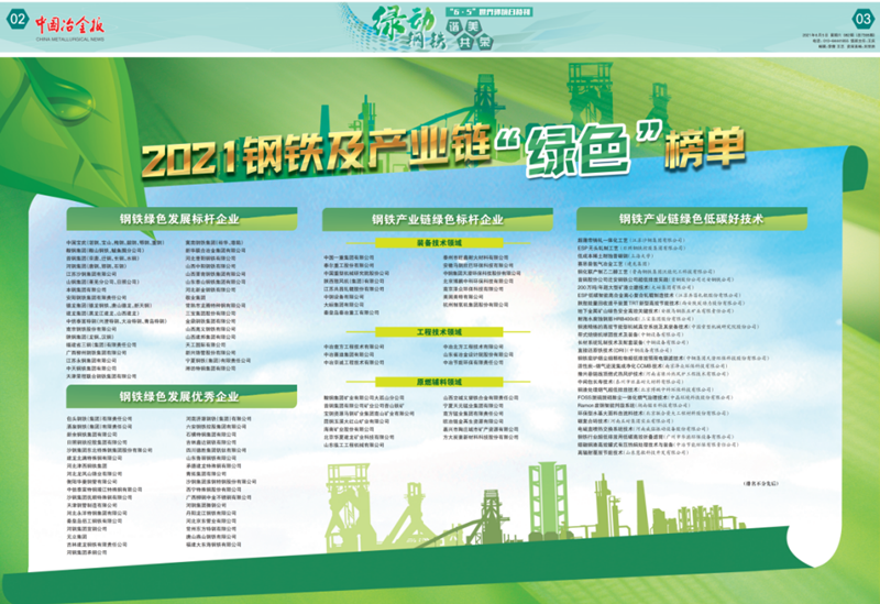 近期中國冶金報公布了2021年度中國鋼鐵品牌企業(yè)和2021年度鋼鐵及產業(yè)鏈“綠色”標桿企業(yè),我公司雙雙上榜。5月10日,第5個中國品牌日,公布了2021中國鋼鐵品牌榜單,公司再次榮獲中國鋼鐵工程技術類“優(yōu)秀品牌供應商”榮譽稱號,我公司已經(jīng)連續(xù)兩年獲得中國鋼鐵工程技術類優(yōu)秀品牌企業(yè)。6月5日,世界環(huán)境日,公布了2021鋼鐵及產業(yè)鏈“綠色”榜單,公司榮獲中國“鋼鐵產業(yè)鏈綠色標桿企業(yè)”稱號。